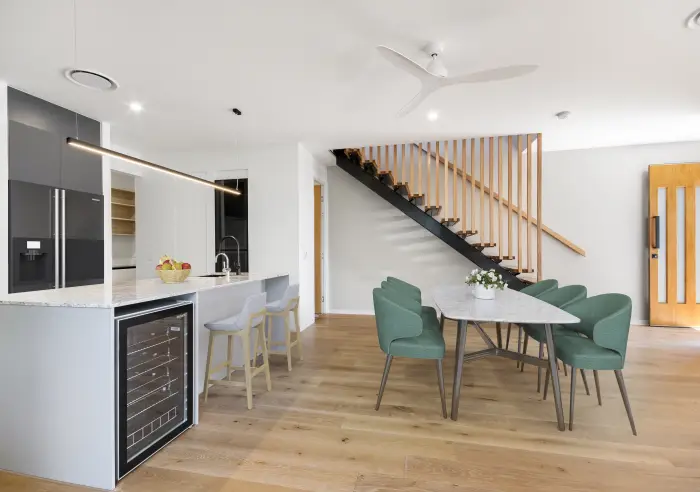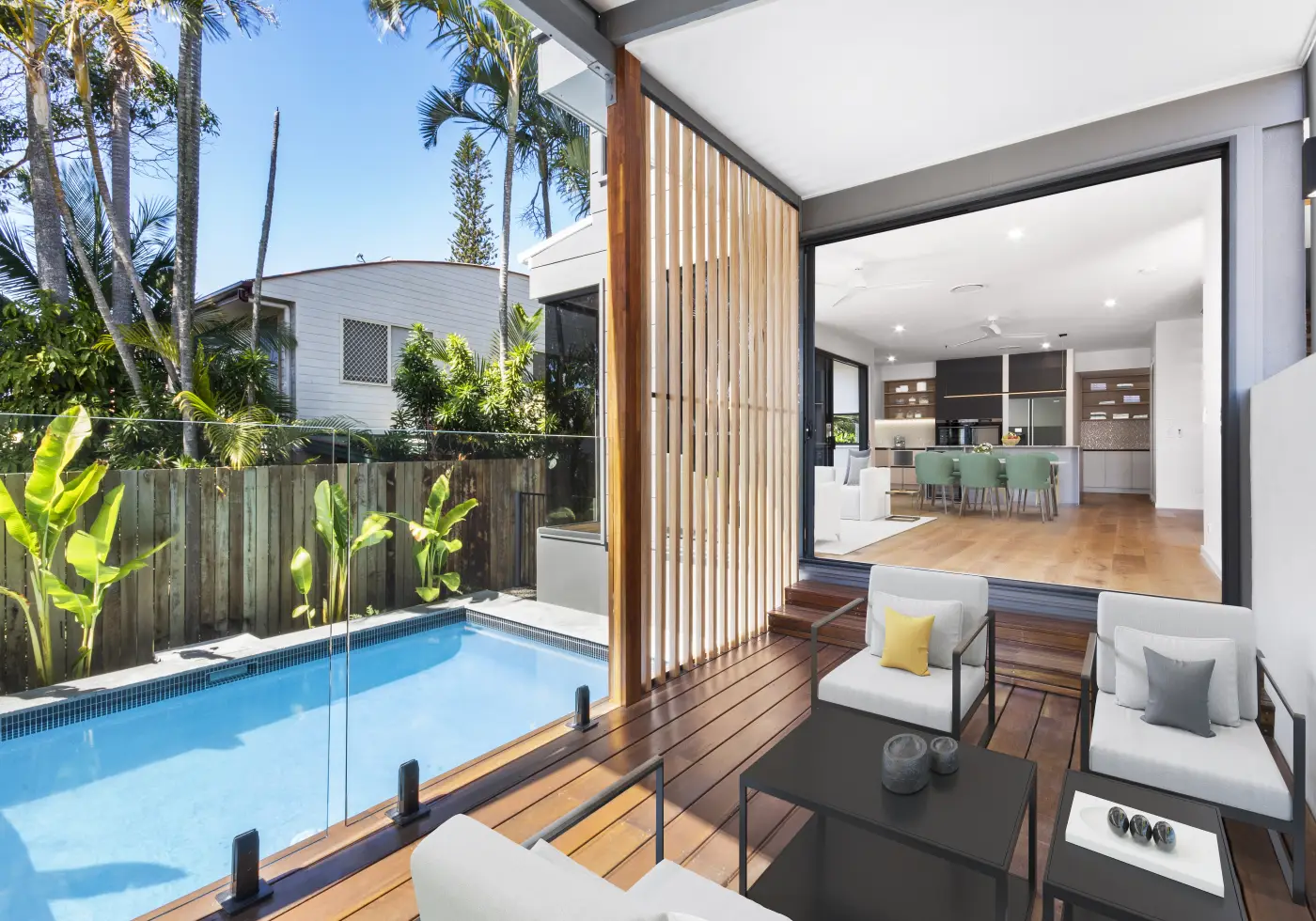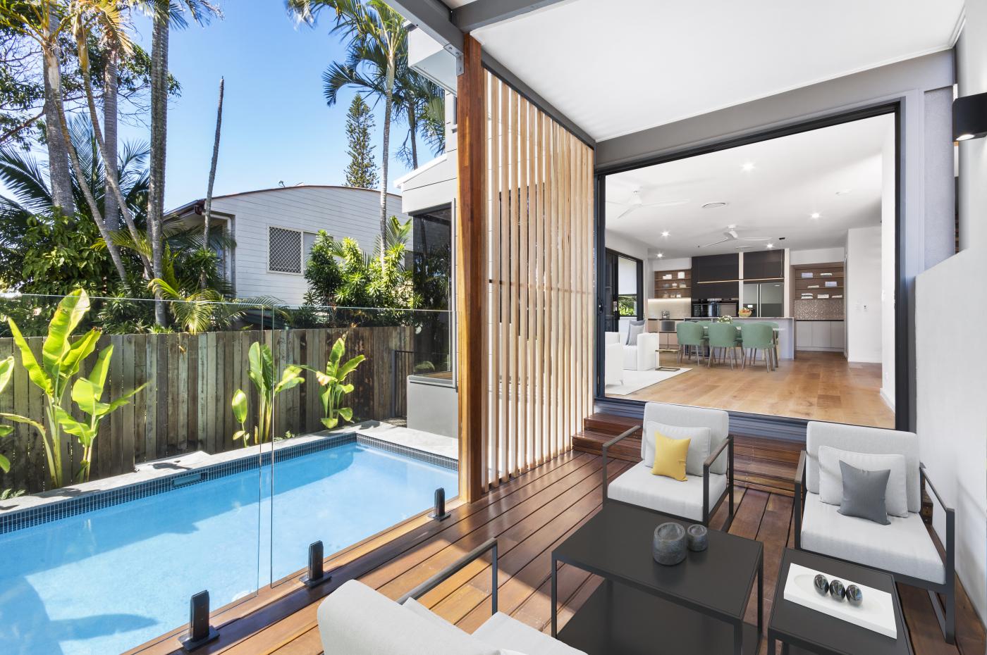 The layout is spacious and light-filled with the main level dedicated to indoor-outdoor living. From the kitchen, you can overlook the living and dining zone with on-trend flooring and a seamless connection to the covered poolside courtyard.
