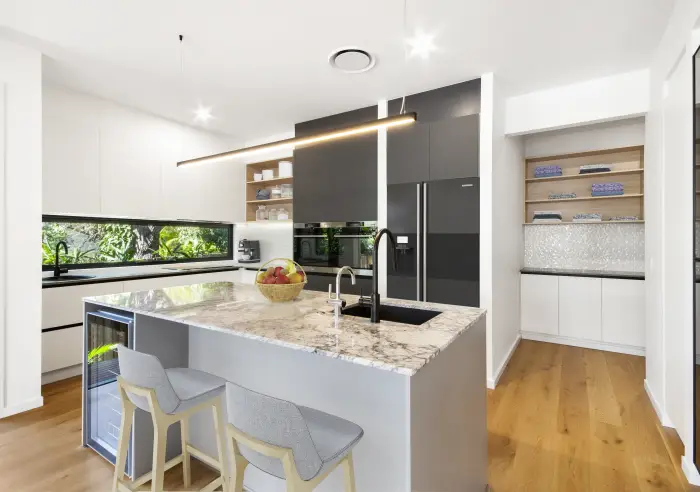Even the most fastidious buyer will adore the gourmet kitchen with a suite of high-end integrated appliances including twin ovens along with sweeping stone benchtops and gorgeous cabinetry. There’s an island with breakfast bar seating and a beverage fridge plus there’s a dishwasher and a striking backsplash.