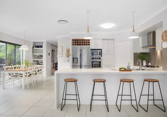 For the chef of the household, there are sweeping waterfall-edge benchtops, stainless steel appliances and a step-in corner pantry along with breakfast bar seating for relaxed meals. From here, you can look out over the backyard or step through the wall of glass sliding doors to the covered alfresco to entertain.